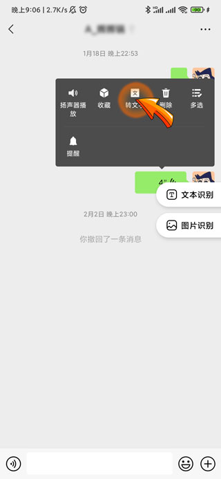 4、最后点击语音上方弹出页面中的“转文字”选项即可。
