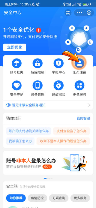 5、最后点击安全中心页面中的“永久注销”图标即可。