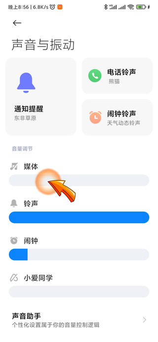 3、之后点击媒体下方的“音量条”并将其右滑即可。