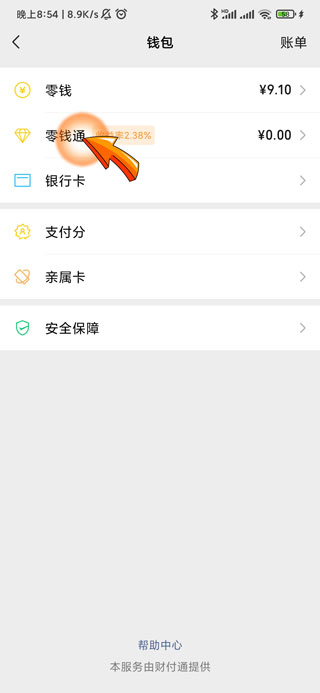 4、然后点击钱包页面中的“零钱通”选项。
