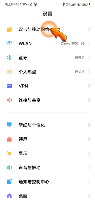 2、然后点击设置页面中的“双卡与移动网络”选项。