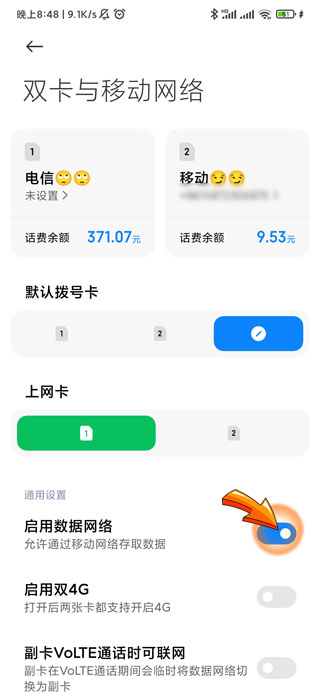 4、最后重新打开“启用数据网络”右侧的开关即可。