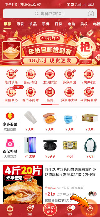 1、拼多多确认收货首先需要打开拼多多APP,点击页面右下角的“个人中心”图标。