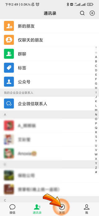 1、微信朋友圈发gif图片首先需要打开微信APP,点击页面下方的“发现”图标。