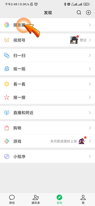 2、然后点击发现页面顶部的“朋友圈”选项。