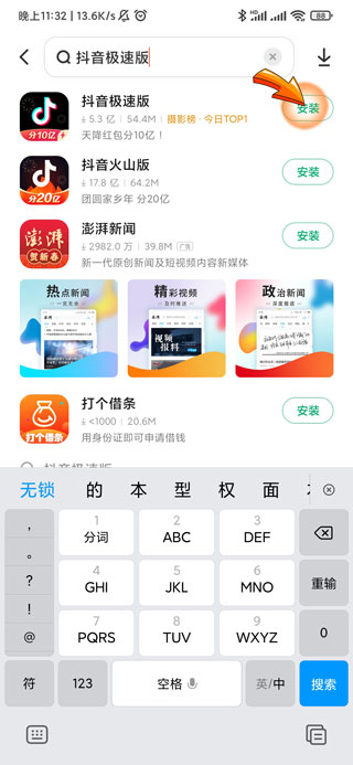 3、最后点击搜索栏下方抖音极速版右侧的“安装”选项,即可进行下载。