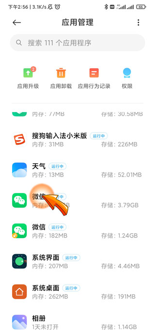 3、然后在应用管理页面中找到并点击“微信”选项。