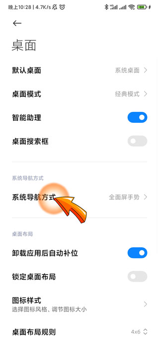 3、之后点击桌面页面中的“系统导航方式”选项。