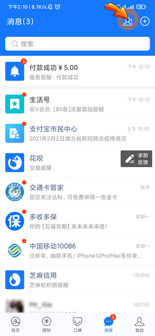 1、支付宝禁止对方转账首先需要打开支付宝APP,点击页面右下方的“消息”图标。