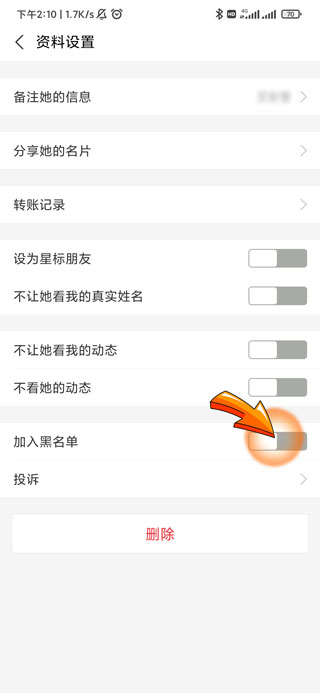 5、最后点击打开“加入黑名单”右侧的开关按钮即可。