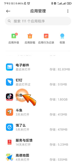 3、之后在应用管理中找到并点击“抖音”选项。