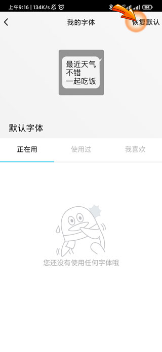 5、最后点击我的字体页面右上角的“恢复默认”选项即可。