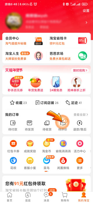 2、然后点击我的淘宝页面中部的“待评价”图标。