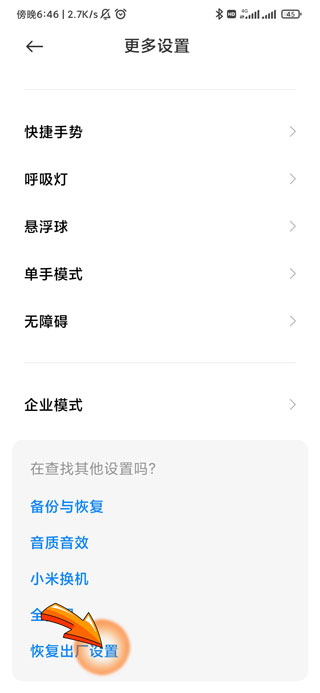 3、将页面滑到最底部,点击“恢复出厂设置”选项。