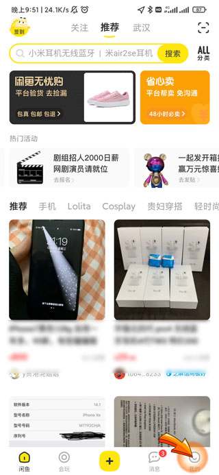1、闲鱼删除订单首先需要打开闲鱼APP,点击首页右下角的“我的”图标。