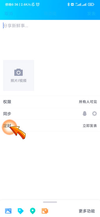 5、最后点击说说编辑页面中的“定时”选项即可设置说说的发表时间。
