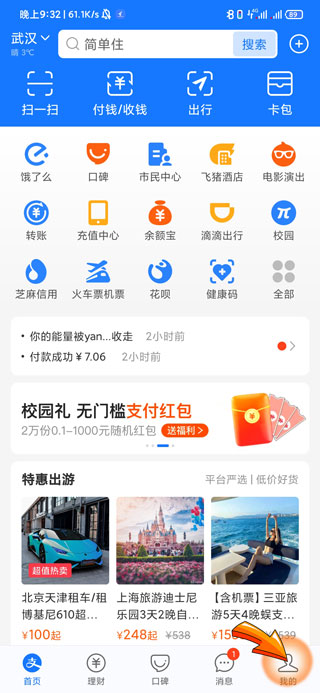 1、支付宝开通花呗首先需要打开支付宝APP,点击页面右下角“我的”图标。