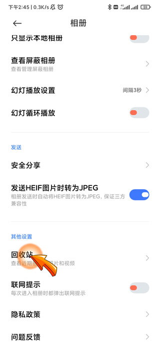 4、最后将页面滑到最底部,点击“回收站”选项即可查找已经删除的照片。