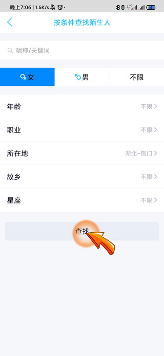 3、最后输入相关条件后,点击页面底部的“查找”选项即可添加陌生人。