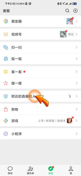 2、进入发现页面后,点击“附近的直播和人”选项。