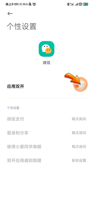 5、最后点击打开应用双开右侧的“开关”按钮即可打开两个微信。