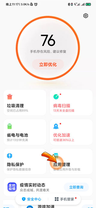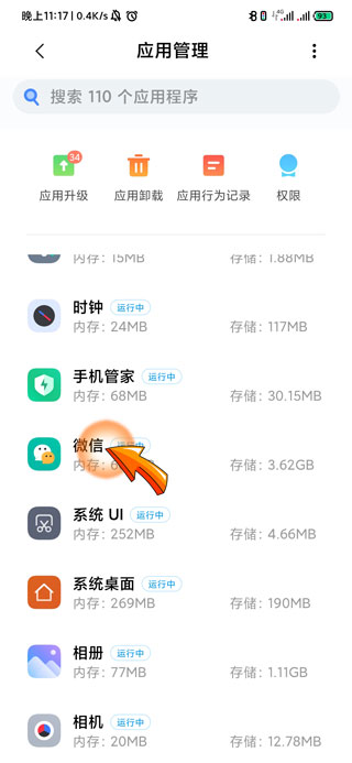 微信一直运行不关闭需要打开微信自启动权限,首先打开桌面上的“手机管家”图标,然后点击“应用管理”选项,找到并点击“微信”图标,最后在应用详情页面点击开启“自启动”右侧的开关按钮即可。