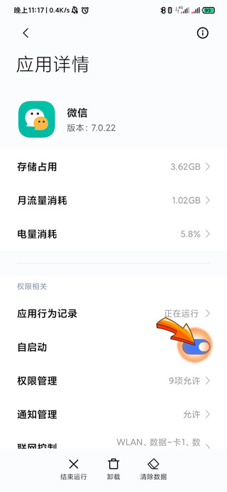 4、最后点击“自启动”右侧的开关按钮即可开启微信自启动。