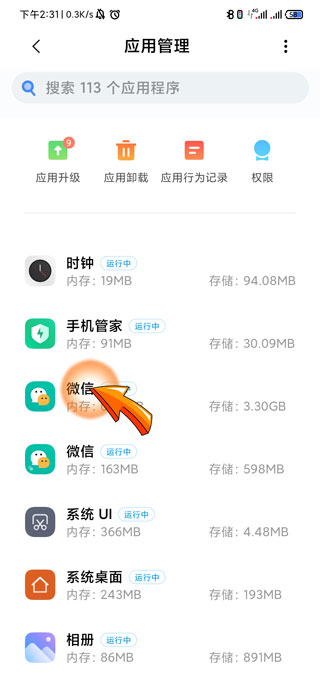 4、在应用管理页面中找到并点击“微信”图标。