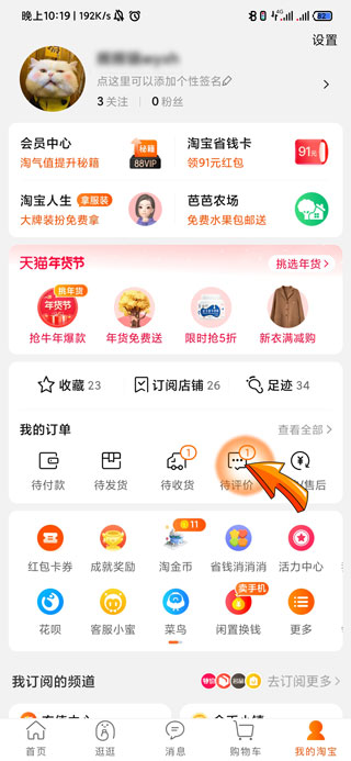 2、然后点击我的淘宝页面中部的“待评价”图标。