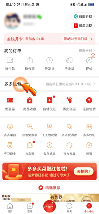 2、然后点击个人中心页面中部的“多多钱包”选项。