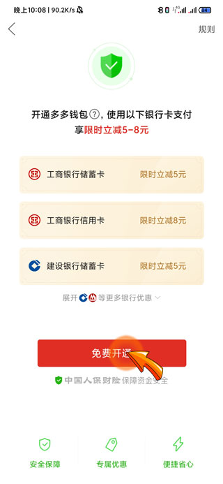 3、最后点击页面下方的“免费开通”选项即可开通多多钱包。