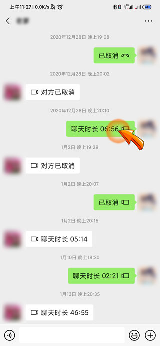 3、此时页面中显示的“聊天时长xxx”即为微信通话时长记录。