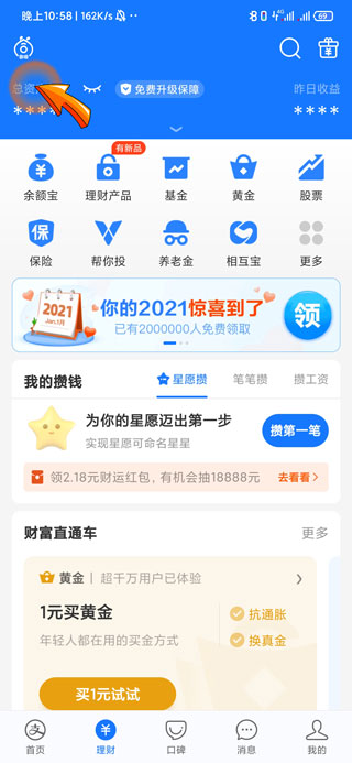 3、最后点击理财页面左上角的“总资产”选项,即可查看支付宝当前的总资产。