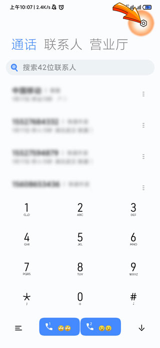 1、手机白名单设置首先需要打开手机电话页面,点击页面右上角的“设置”齿轮图标。