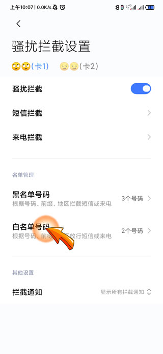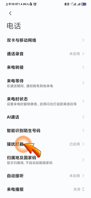 2、进入页面后找到并点击“骚扰拦截”选项。