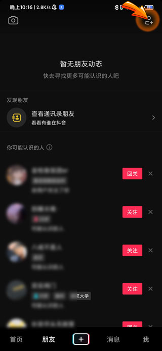 1、抖音搜索朋友首先需要打开抖音APP,点击页面底部的“朋友”选项。
