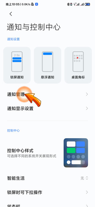 2、进入设置页面后,找到并点击“通知与控制中心”选项。