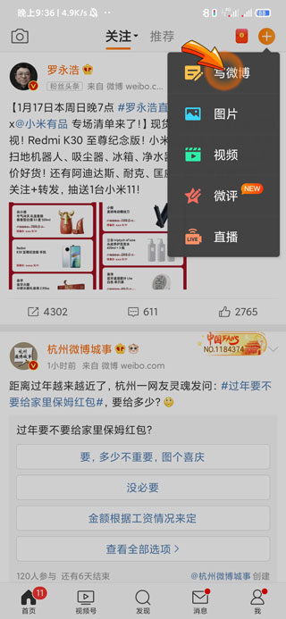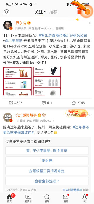 1、微博指定好友可见首先需要打开微博APP,点击页面右上角的“加号”图标。