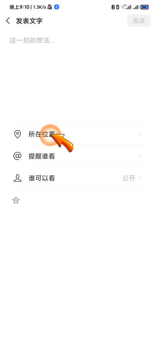 4、最后点击发表文字页面中的“所在位置”选项,即可设置地址名称。