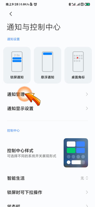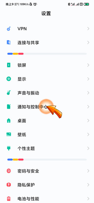 2、进入设置页面后,点击“通知与控制中心”选项。