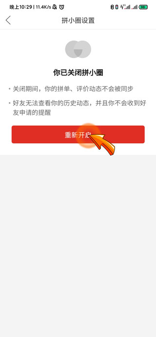 拼多多查看好友已买的东西需要开启拼小圈,首先打开拼多多APP,点击首页右下角的“个人中心”图标,然后点击“设置”图标,再点击“拼小圈设置”选项,最后点击“重新开启”选项即可查看好友购买的东西。