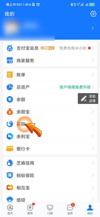 2、然后点击我的页面中的“花呗”选项。