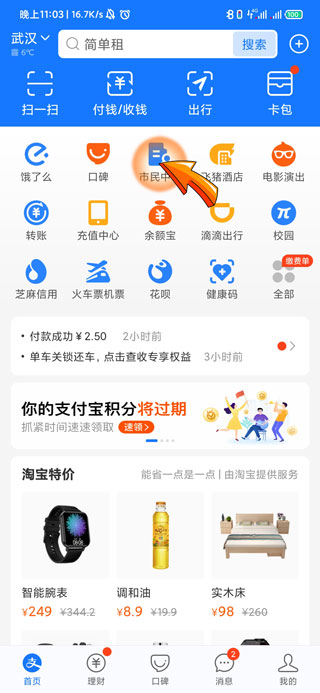 1、支付宝激活医保码首先需要打开支付宝APP,点击页面上方的“市民中心”图标。