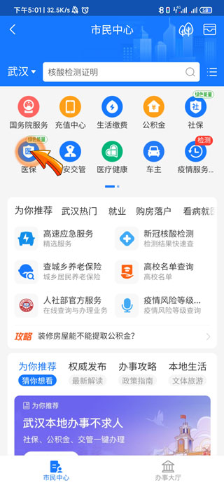 2、然后在市民中心中找到并点击“医保”选项。