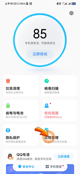 2、进入手机管家页面后,点击“应用设置”选项。