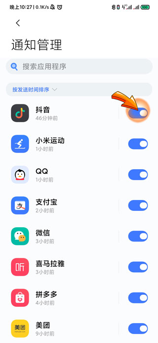 4、在通知管理页面中找到需要屏蔽广告的APP,点击关闭右侧的开关按钮即可。