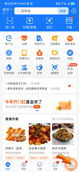 1、支付宝设置限额支付首先需要打开支付宝APP,点击首页右下角的“我的”图标。