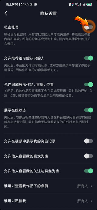 5、最后点击打开“私密账号”右侧的开关按钮即可。