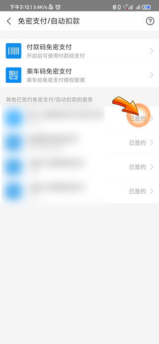 5、选择需要关闭的免密支付项目,点击其右侧的“已签约”选项。