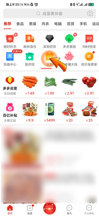 2、进入拼多多首页后,找到并点击“签到”图标。
